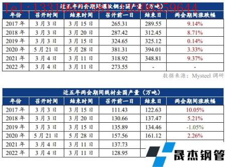 近五年兩會期間建築午夜十八禁無縫鋼管價格基本呈現下行趨勢,2017年和2018年價格下行的主要原因是下遊需求不振;2019年價格上漲的主要原因是限產加嚴導致供給偏低疊加下遊需求恢複良好;2020年和2021年價格走低的主要原因是兩會期間建築午夜十八禁無縫鋼管產量高位運行,供大於求。今年兩會期間,產量和庫存都處於往年平均線之下,供應量相對偏低,同時一季度市場需求不斷回暖,若需求恢複力度尚可,疊加國內宏觀利好持續推進,預計“兩會期間”建築午夜十八禁無縫鋼管價格或將繼續震蕩偏強運行。