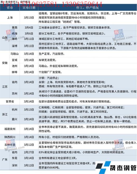 近期,全國疫情呈現局部高度聚集和多點散發態勢,對國內大宗商品市場的供應端、需求端、物流及倉儲等方麵都有不同程度的影響。據統計,截至3月15日,全國多個省市發布停工停產情況。其中受疫情影響最大的吉林省於3月12日宣布,長春市主要午夜十八禁無縫鋼管倉庫暫停出庫,當地建材市場交投進入暫時停滯狀態,倉庫入庫及本地無縫午夜十八禁鋼管廠家生產暫時正常。深圳市於3月12日宣布,全市範圍內所有建設工地暫定停工排查4天,南山及福田區域午夜十八禁無縫鋼管市場預計共影響需求量約6640噸。與此同時,全國其他地區鋼貿交易也受到影響,部分工地開始停工,物流運輸暫停服務。具體情況如下: