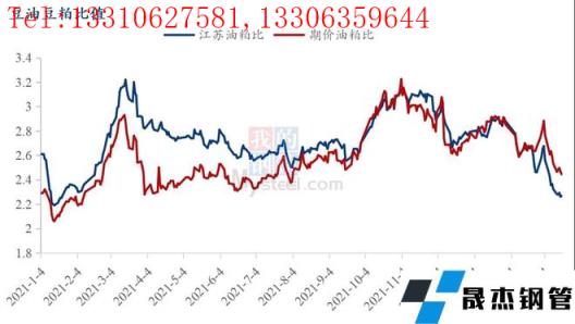 其六:3月份以來豆油價格見高回落,豆粕價格被動變得更加堅挺。3月初,豆粕期現貨價格雙雙創出階段性高位後出現一輪回撤走勢。從下圖油粕比走勢來看,2022年3月3日,江蘇地區現貨豆油豆粕比值2.68,期價主力合約豆油豆粕比值2.88;截止3月18日,江蘇地區現貨豆油豆粕比值下降至2.27,期價主力合約豆油豆粕比值下降至2.44。期間外圍CBOT大豆價格整體高位盤整為主,因此豆粕估值獲得被動提升。