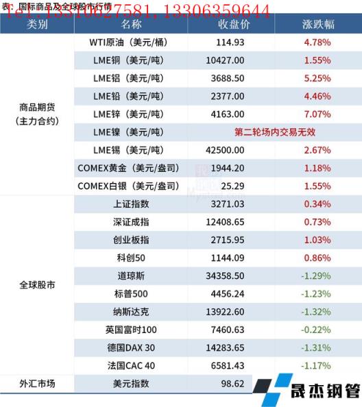 ◎中鋼協數據顯示,2022年3月中旬,重點鋼企粗鋼日均產量204.93萬噸,環比增長4.61%;午夜十八禁無縫鋼管庫存量1712.49萬噸,比上一旬增加44.29萬噸,增長2.66%。詳情>>