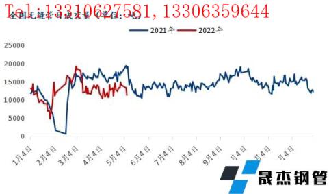 從4月份的成交數據來看,4月份國內無縫管日均成交量在1.25萬噸,去年4月份整體日均成交在1.65萬噸,4月份成交量相較去年同期明顯減少,而進入5月份無縫管需求量整體偏低,日前無縫管日成交量處於1.1萬噸的水平,在預期中,市場原本可能被釋放的需求還是未得到釋放,供需兩弱格局延續,短期來看5月強預期“不強”。由於目前市場還是處於供需雙緊的情況,所以無縫管的價格還能保持相對堅挺。