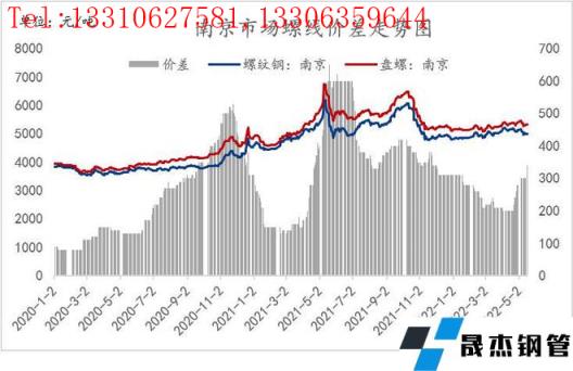 南京市場2021年螺線最小價差出現的時間在2月20日前後,春節剛過市場庫存大量疊加,低價資源湧現,螺線價差僅有130元/噸;3-4月終端需求放量,市場庫存有效釋放,庫存向低值靠近,5月20日前後螺紋價差達到年度最大值約650元/噸;年度螺線價差均值達到346元/噸,較上一年度增加107元/噸。進入本年度,4月中上旬南京市場螺線價差僅有200元/噸,也處於上半年的穀值,而從五一小長假過後,市場螺線價差逐步擴大至350元/噸。