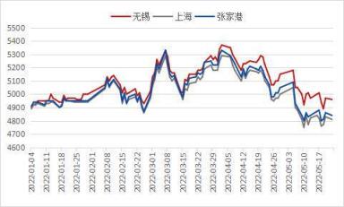 從年初開始,本地市場價格是處於4900元/噸的水平,對比曆年來講這個價格算是偏高的,到2月10號之前基本上處於小幅平穩上漲的態勢,出現了一個小極值在5150元/噸,第二個高點出現在3月8號左右,價格處於5350元/噸左右,此時周邊市場開始受到疫情管控的影響,資源運輸不暢,倉庫提貨困難,市場價格開始大幅下行,到三月中旬總共下跌了300元/噸,下半月市場需求情況受傳統旺季提振有一定恢複,到3月底四月初達到了第三個高點5370元/噸的水平,也是目前為止的最高點,和去年上半年高點相比大幅下降。從4月初一直到現在,中間雖然有階段性反彈,但是價格趨勢整體呈現震蕩下跌的態勢,目前處於4890元/噸的水平,基本上平了2022年年初的水平。