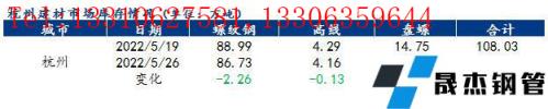 分品種來看,以杭州市場為例,本周杭州市場建築午夜十八禁無縫鋼管總庫存為102.80萬噸,其中螺紋鋼庫存86.73萬噸,周環比減少2.26萬噸,降幅為2.54%;盤螺11.91萬噸,周環比減少2.84萬噸,降幅為19.25%;線材4.16萬噸,周環比減少0.13萬噸,降幅為3.03%。