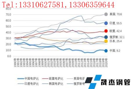 電爐鋼是以電力為能源、以再生鋼鐵料為原料的煉鋼爐生產的鋼。這種短流程煉鋼與以鐵礦石為主要原料的長流程煉鋼在原料使用上有本質的區別。從電爐鋼的占比情況看,中國粗鋼生產90%以上依賴長流程,即以鐵礦石為主要原料的生產方式,並且受製於國產鐵精礦的產量不足,對進口鐵礦石的依存度很高。截止到2020年,據世界鋼協(WSA)的統計數據,全球電爐鋼產量占比為26.1%。主要產鋼國中,美國為70.6%,土耳其為69.2%,印度電爐比為55.5%,歐盟(28)為42.4%,俄羅斯為32.1%,韓國為31.0%,日本為25.4%。中國電爐鋼占比在20世紀90年代曾超過20%,但由於之後中國長流程煉鋼規模迅速擴大,電爐鋼占比不斷被稀釋,至2020年已降至9.2%。從目前情況看,美國、印度和歐盟鋼鐵生產對鐵礦石依存度相對低很多。