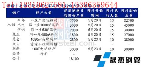 據不完全統計,截至5月20日,國內13家無縫午夜十八禁鋼管廠家發布檢修計劃。其中,中天鋼鐵因一座轉爐檢修,坯料不足,兩條棒材線停產檢修,預計5月份影響棒材產量4.5萬噸。