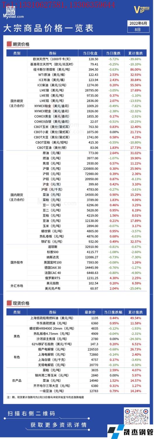 免責聲明:本網站(山東聊城午夜黄视频無縫鋼管廠www.bl-lenscare.com)刊載的“俄烏局勢丨大宗商品價格一覽表(6月8日)”等均源於網絡,版權歸原作者所有,且僅代表原作者觀點,本文所載信息僅供參考。轉載僅為學習與交流之目的,如無意中侵犯您的合法權益,請及時聯係刪除。本網站刊登此篇文章並不意味著本站讚同其觀點或證實其內容的真實性,午夜黄视频不對其科學性、嚴肅性等作任何形式的保證。如果侵犯了您的版權,請盡快聯係午夜黄视频予以撤銷,謝謝合作!